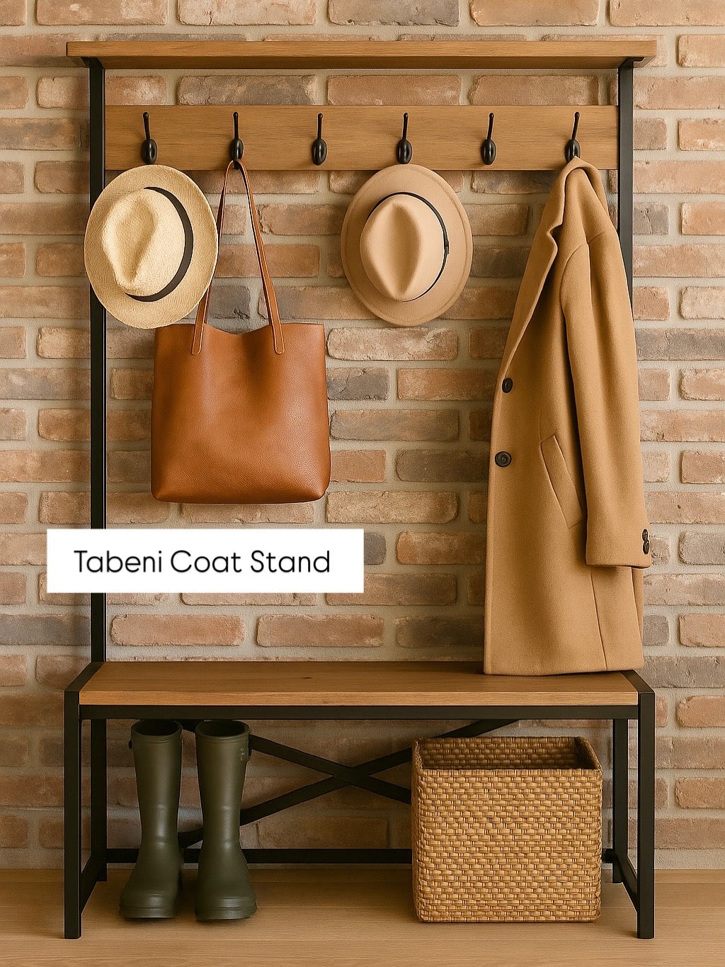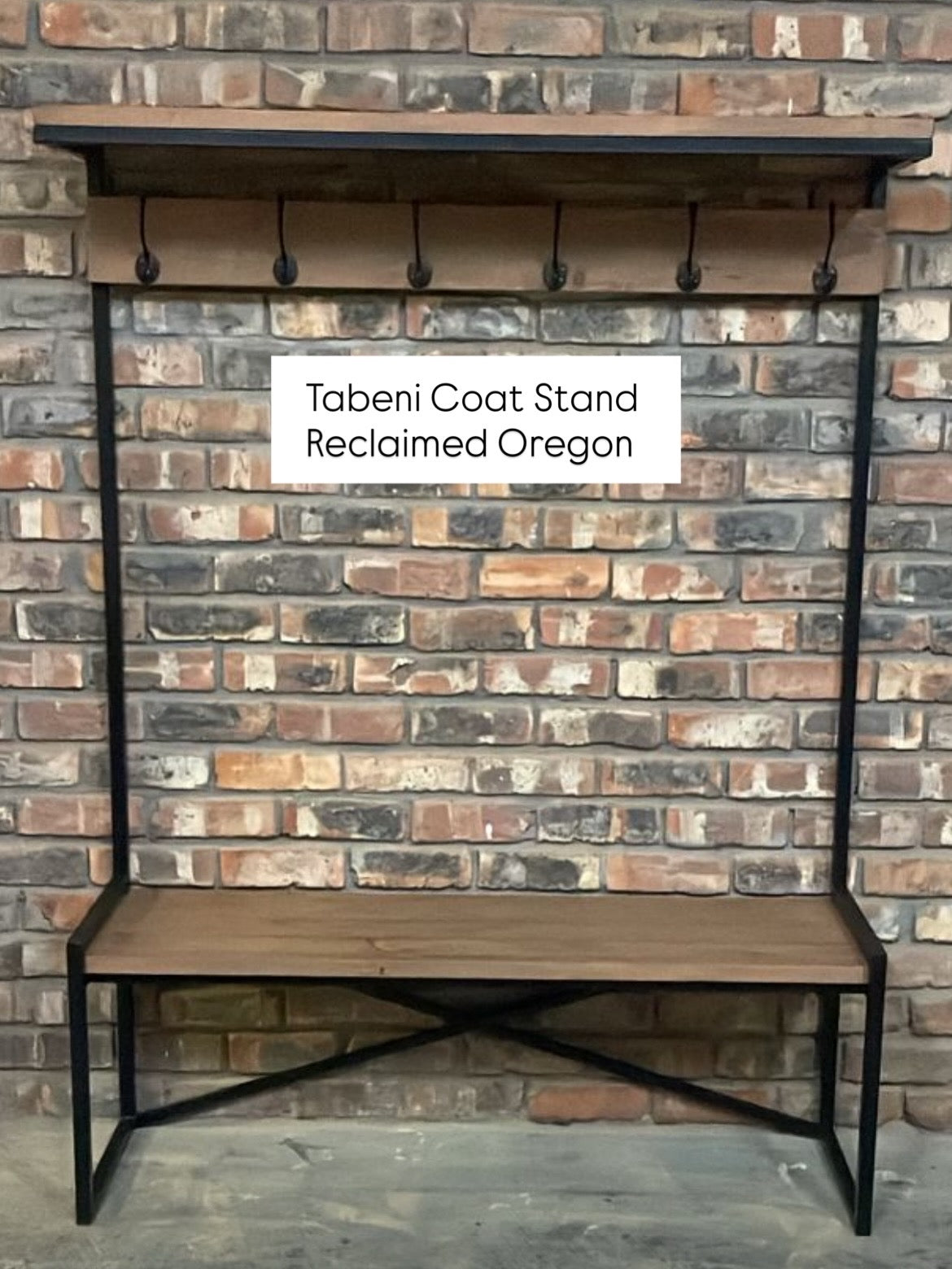 Custom Reclaimed Oregon and black steel entryway bench with coat hooks, hats, and boots — handcrafted by Vintage Etc in South Africa